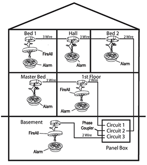 Most houses are fed from a 220 volt service which is then split into two phases of 110 volts each in the circuit breaker panel (“breaker box”). The RF signals which are impressed onto the house wiring on one phase, may not travel across to the other phase through the breaker panel. If however, the data transmission is not making it from one phase of house wiring to the other, you may couple the signal between them by having a qualified electrician install a 0.1 microfarad, 240V AC capacitor across your 220 volt line from hot to hot, i.e. across any 220 volt breaker. Or, you can install a phase coupler (or phase bridge). Alternately, you may just solve the problem by simply moving the circuits with the FireAlls to the same phase in the panel box.